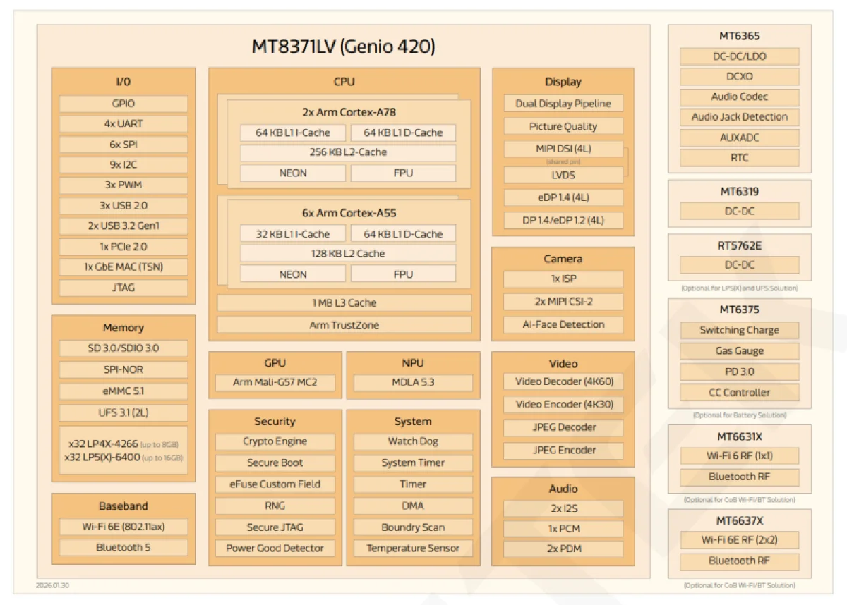 Следующая новинка, Genio 420, создана с применением 6-нанометрового техпроцесса. Её основу составляет восьмиядерная конфигурация (два ядра Arm Cortex-A78 с частотой 1,8 ГГц и шесть ядер Arm Cortex-A55 на 1,6 ГГц) в сочетании с графическим процессором Arm Mali-G57 MC2. Вычисления искусственного интеллекта с производительностью до 6,1 TOPS обеспечивает нейронный процессор MediaTek восьмого поколения. Видеопроцессор способен кодировать поток в форматах H.264/H.265 (максимум 4Kp30) и декодировать H.264/H.265/VP9 (до 4Kp60), а также MPEG4/VP8 (с разрешением до 1080p60).