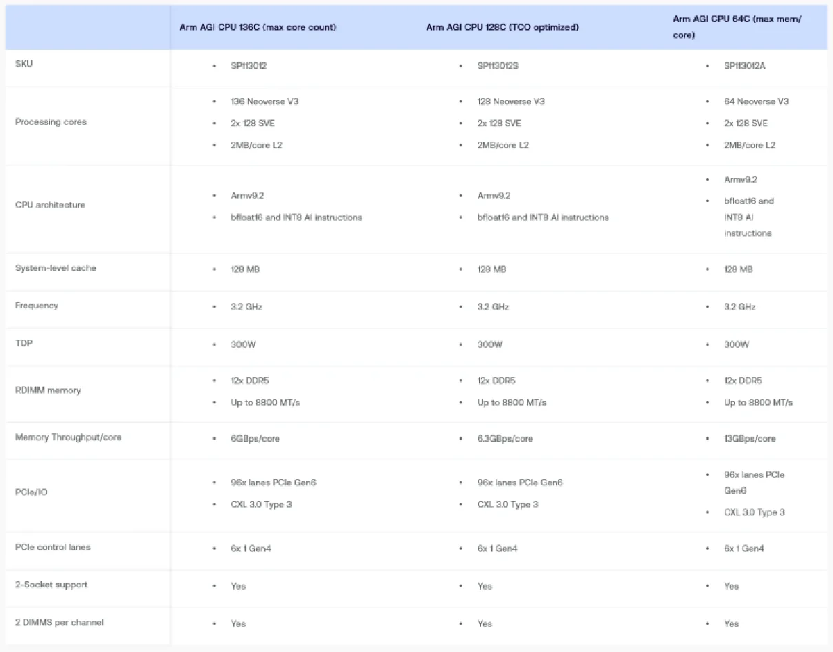 Флагманский процессор AGI от Arm — это модель SP113012, оснащённая 136 ядрами Neoverse V3 (Poseidon) с тактовой частотой до 3,7 ГГц (базовая частота — 3,2 ГГц). Ядра распределены между двумя чиплетами, произведёнными по 3-нм технологии TSMC. Каждое ядро включает два 128-битных SVE-блока для векторных операций и поддерживает инструкции MMLA с форматами BF16/INT8. Чип обладает 2 МБ кэша L2 на ядро и 128 МБ общего системного кэша (SLC). Он предлагает 96 линий PCIe 6.0 с поддержкой CXL 3.0 (Type). Пропускная способность памяти достигает 6 ГБ/с на ядро при целевой задержке менее 100 нс, а для работы доступно 12 каналов DDR5-8800 (2DPC).