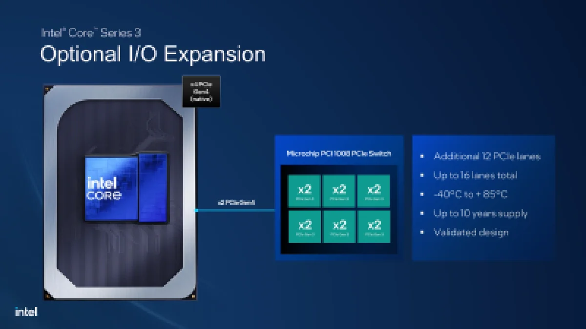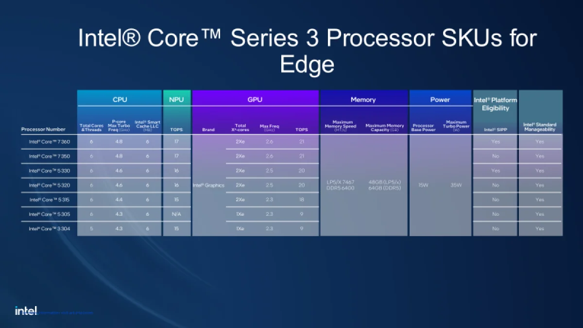 Процессоры Core Series 3 поддерживают работу с памятью LPDDR5Х-7467 объёмом до 48 ГБ или DDR5-6400 до 64 ГБ. Платформа обеспечивает шесть линий PCIe 4.0 (две из которых можно направить через коммутатор Microchip PCI 1008 для получения шести пар линий PCIe 3.0), два порта Thunderbolt 4, а также беспроводные интерфейсы Wi-Fi 7 R2 и Bluetooth 6.
