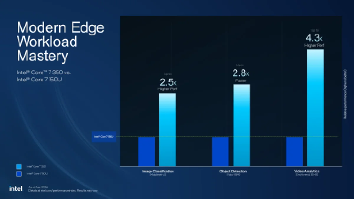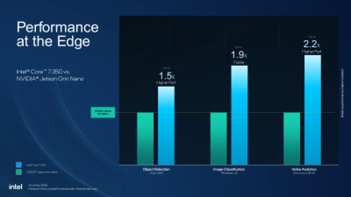 Согласно заявлению производителя, флагманский чип линейки Wildcat Lake — Intel Core 7 350 — демонстрирует превосходство над решениями NVIDIA Jetson Orin Nano: он быстрее в 1,5 раза при распознавании объектов и в 1,9 раза при сортировке изображений. В сценариях видеоаналитики его отрыв достигает 2,2 раза.