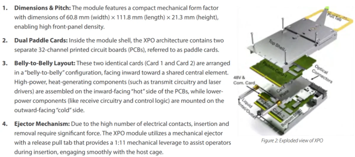 Модуль XPO вмещает 64 канала по 200 Гбит/с (224 Гбит/с с кодированием PAM4) в габаритах, сопоставимых с двумя модулями формата OSFP. В высоту 1OU можно разместить 16 таких модулей, обеспечив суммарную пропускную способность 204,8 Тбит/с на юнит или 6,5 Пбит/с на стойку стандарта ORv3. Это примерно в четыре раза превышает показатели модулей OSFP 1,6T, отмечает ресурс The Next Platform. XPO поддерживает интегрированное жидкостное охлаждение (водяной блок), совместим с различными типами оптики и обеспечивает существенный рост надёжности. Стандарт работает с оптическими интерфейсами SR, DR, FR, LR и ZR/ZR+, а также сохраняет совместимость с архитектурой LPO.