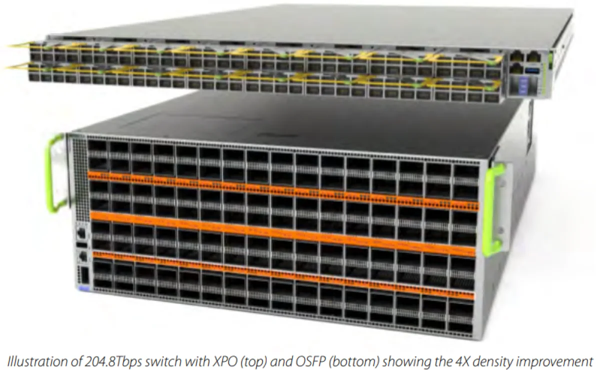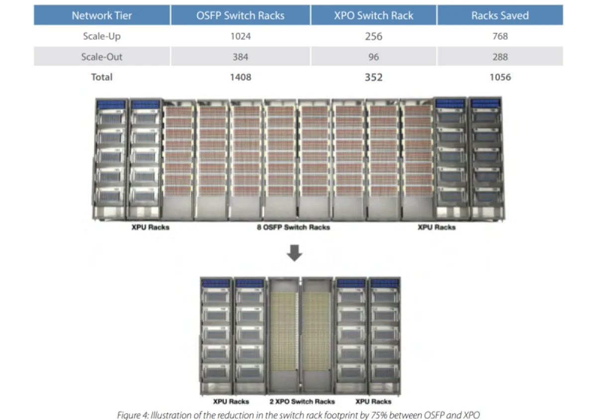 Как сообщил Андреас Бехтольсхайм (Andreas Bechtolsheim), сооснователь и главный архитектор Arista, для ЦОД ИИ мощностью 400 МВт, состоящего из 1024 стоек с 128 графическими процессорами в каждой, при расчёте 12,8 Тбит/с на вертикальное и 1,6 Тбит/с на горизонтальное масштабирование для каждого GPU с использованием коммутаторов на базе OSFP плотностью 1,6 Пбит/с на стойку, потребовалось бы более 1400 стоек. Внедрение XPO позволит сократить число стоек на 75%, одновременно экономя 44% площади дата-центра.