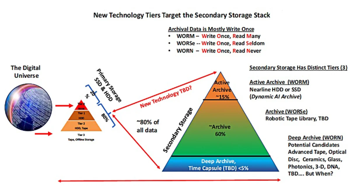 Альянс Active Archive выделяет три категории доступа к данным — WORM (однократная запись, многократное чтение), WORSe (однократная запись, эпизодическое чтение) и WORN (однократная запись, отсутствие чтения). Каждая из них соответствует определённому типу хранения: активному, архивному и глубокому. Эти категории формируют вторичные массивы, где, согласно оценкам, сосредоточено порядка 80% информации (оставшиеся 20% размещаются в высокопроизводительных первичных системах). При этом активный уровень занимает примерно 15% общего объёма, архивный — 60%, а глубокому отводится лишь 5%.