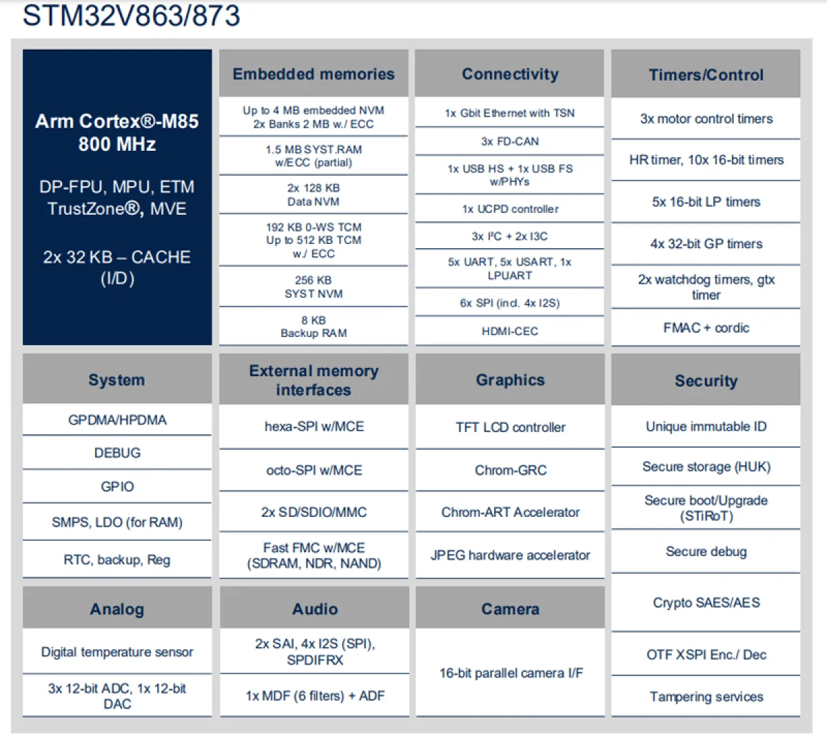Кристалл включает графический модуль Chrom-ART 2D GPU и специализированный JPEG-акселератор. Предусмотрено 1,5 МБ системной памяти SRAM с коррекцией ошибок ECC и 8 КБ резервной памяти Backup RAM. Реализованы интерфейсы внешней памяти Hexa-SPI, Octo-SPI, 2 × SD/SDIO/MMC, SDRAM, NAND. Указана поддержка 1GbE, 2 × SAI, 4 × I2S, S/PDIF Rx, 1 × USB HD, 1 × USB FS, UCPD (USB-C PD), 3 × I2C, 2 × I3C, 5 × USART, 5 × UART, 1 × LPUART, 3 × FD-CAN, 6 × SPI, 3 × ADC (12 бит), 1 × DAC (12 бит).