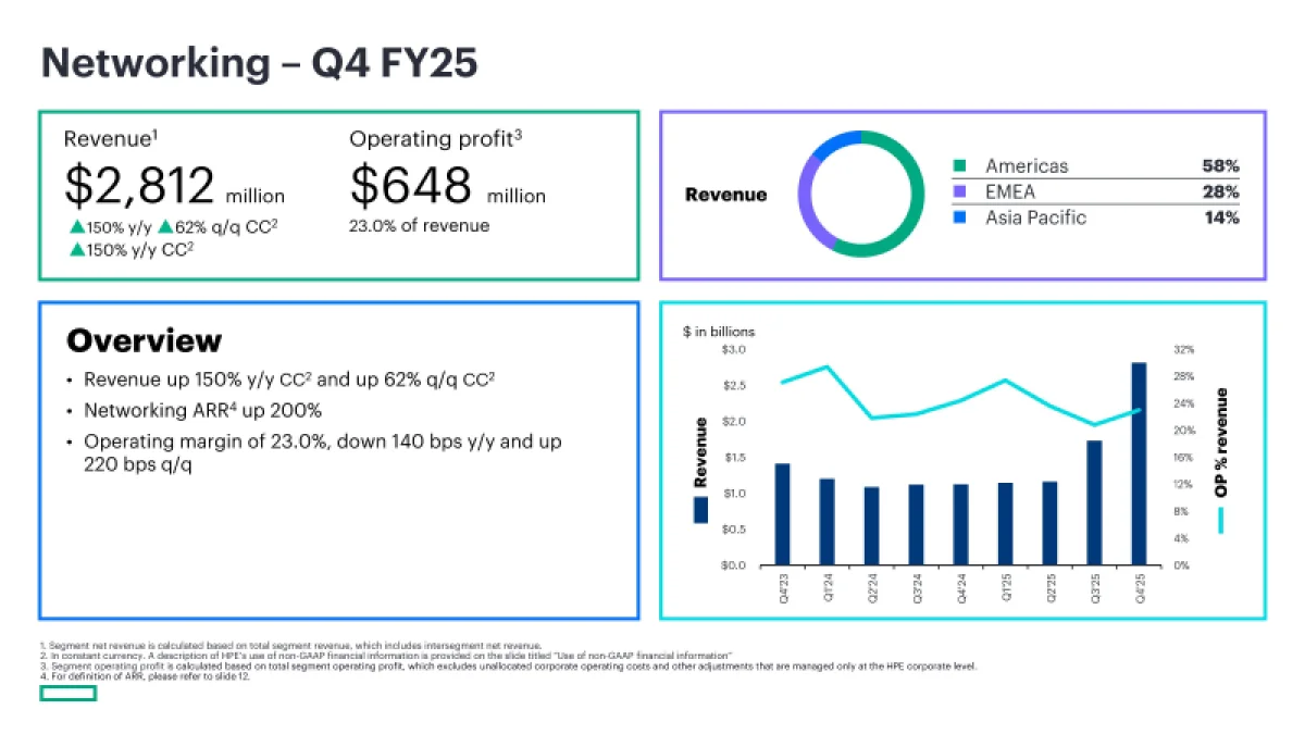 Как сообщил Нери, за прошедший год число клиентов, использующих сервисную модель IT-as-a-Service GreenLake, увеличилось примерно на 7 тысяч, достигнув к концу отчётного периода 46 тысяч. Он подчеркнул, что HPE превратилась в «компанию, сфокусированную на сетевых решениях», которая готова «обеспечивать выдающиеся перспективы и потенциал для роста как в области облачных технологий, так и в сфере искусственного интеллекта», — передаёт The Register. Компания скорректировала в сторону повышения годовой прогноз роста выручки от сетевого оборудования до +65–70 % по отчётным данным, что, согласно расчётам ресурса MSN, предполагает объём выручки около $11 млрд.