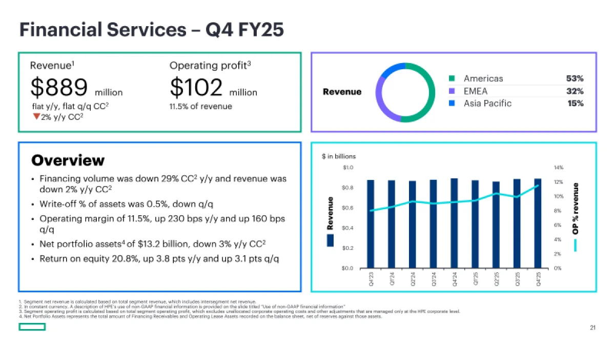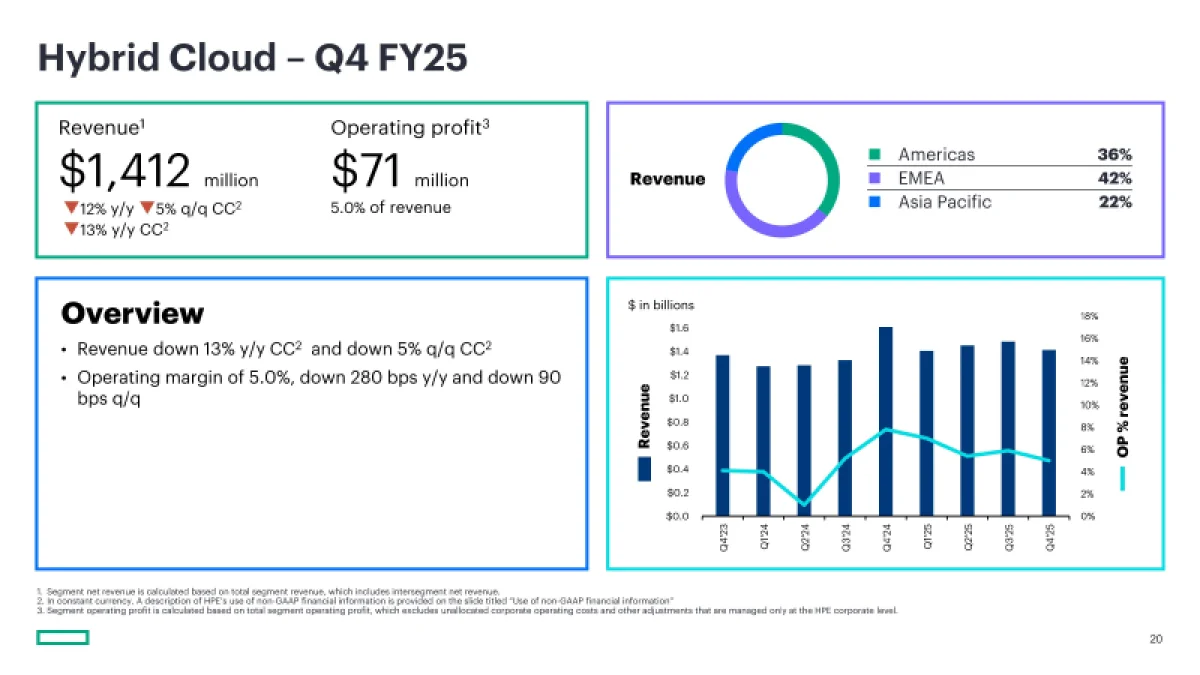 Согласно отчётности по стандартам GAAP, HPE завершила квартал с операционным убытком в $8 млн, тогда как за аналогичный период прошлого года была зафиксирована операционная прибыль в $693 млн. Чистая прибыль компании в четвёртом квартале составила $146 млн, или 11 центов на разводнённую акцию, что существенно ниже показателя годичной давности в $1,34 млрд, или 99 центов на акцию. Годовой регулярный доход (ARR) продемонстрировал рост на 63 % в годовом сопоставлении, достигнув $3,2 млрд.