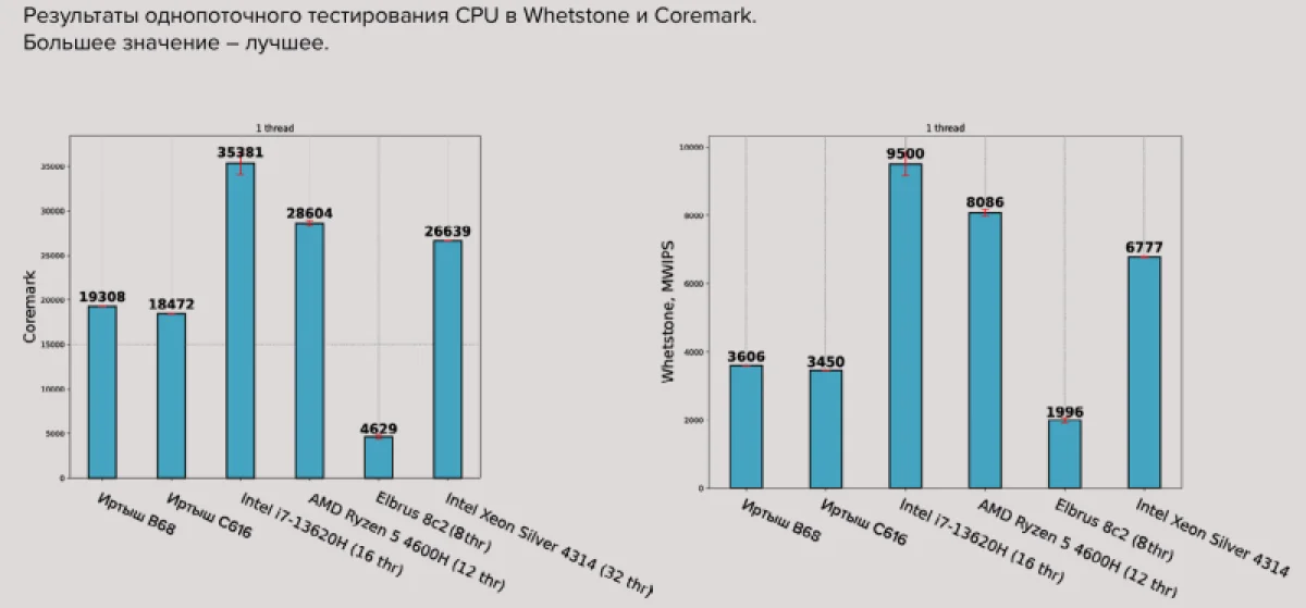 Модель «Иртыш» C632 (К1902ВМ2Я) состоит из двух чиплетов, объединяет 32 ядра (32C/64T), 128 линий PCIe 4.0 и восемь каналов DDR4-3200 ECC (до 1 ТБ), а её TDP составляет 180–200 Вт. При пиковой частоте 2,1 ГГц её производительность достигает 1612,8 Гфлопс. Флагманская версия «Иртыш» C664 (К1902ВМ3Я) создана на четырёх чиплетах, содержит 64 ядра (64C/128T) и имеет TDP 250–300 Вт. При максимальной частоте 2 ГГц её расчётная производительность — до 3072 Гфлопс. Количество каналов памяти и линий PCIe у неё такое же, как у C632. На базе C616 и C632 возможны конфигурации с 1, 2 или 4 процессорами (1S, 2S, 4S), а для C664 поддерживаются только одно- и двухпроцессорные системы (1S, 2S).