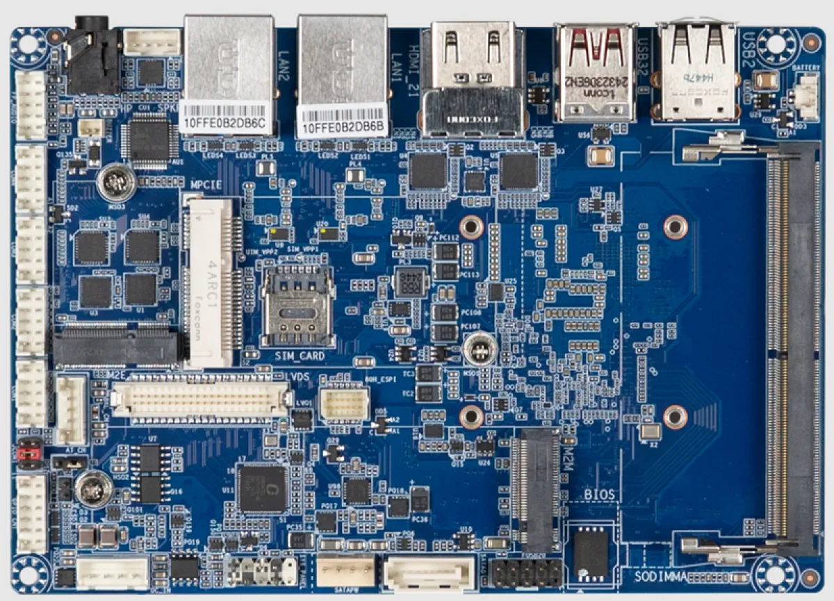 Модель PICO-x7433REAT выполнена в компактном форм-факторе Pico-ITX (100 × 72 мм). Она оснащена разъёмом M.2 2280 с ключом M (PCIe 3.0 x2) для установки SSD и слотом M.2 2230 с ключом E (PCIe x1, USB 2.0) для модуля Wi-Fi/Bluetooth. Сетевая подсистема представлена двухпортовым контроллером Gigabit Ethernet (Realtek RTL8111H). Также на борту находятся порты USB 3.2 Gen1 и USB 3.2 Gen2, два разъёма RJ45. Поддержка двух дисплеев реализована через интерфейсы HDMI 2.0 (разрешение до 4096 × 2160@60 Гц) и LVDS (до 1920 × 1200@60 Гц). Через внутренние коннекторы можно активировать два дополнительных порта USB 2.0 и один последовательный порт (RS-232/422/485).