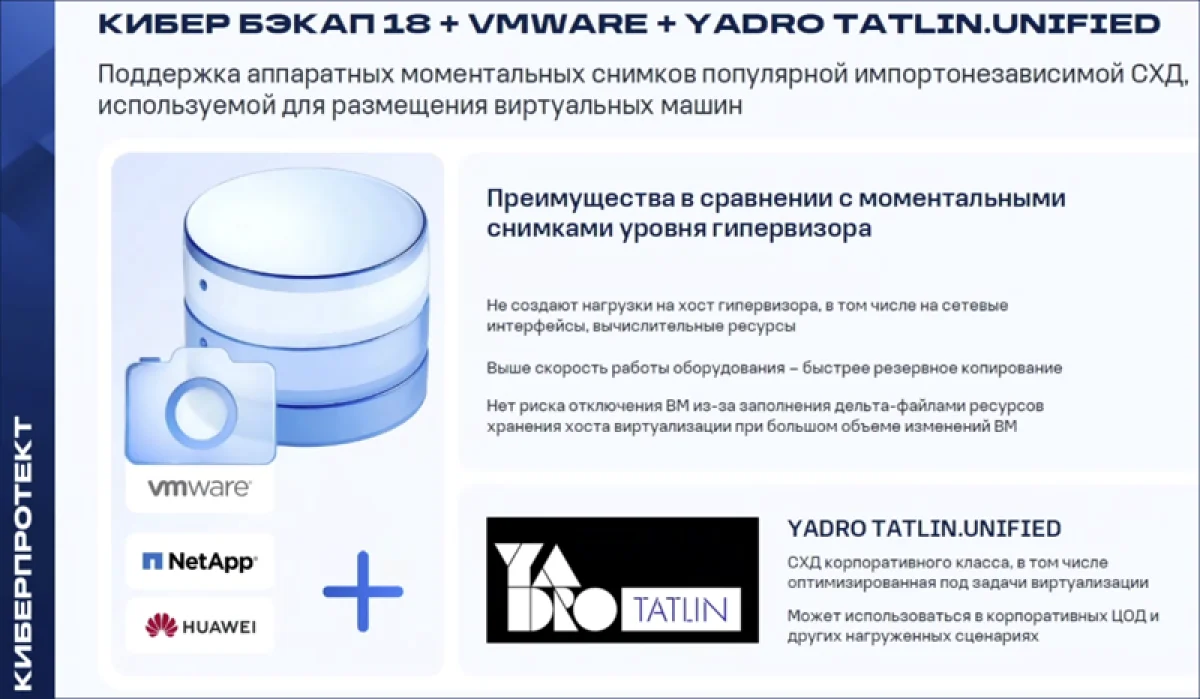 В версии «Кибер Бэкап» 18.0 перечень поддерживаемых систем виртуализации на уровне гипервизора пополнился Proxmox VE и основанной на ней платформой «Альт Виртуализация». Кроме того, появилась возможность создания аппаратных снапшотов виртуальных машин через систему хранения данных YADRO TATLIN.UNIFIED для окружений VMware.