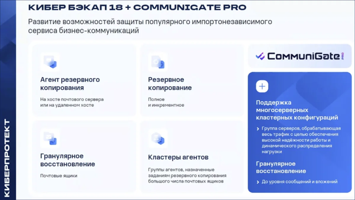 Существенные улучшения затронули инструменты взаимодействия с российской платформой CommuniGate Pro — теперь реализована работа с кластерными многосерверными конфигурациями для масштабных развёртываний коммуникационных служб, включая детализированное восстановление вплоть до отдельных почтовых ящиков, электронных писем и прикреплённых файлов. Кроме того, интегрирована защита сервиса Mailion, позволяющая восстанавливать как целые почтовые ящики, так и отдельные сообщения в их первоначальное местоположение.