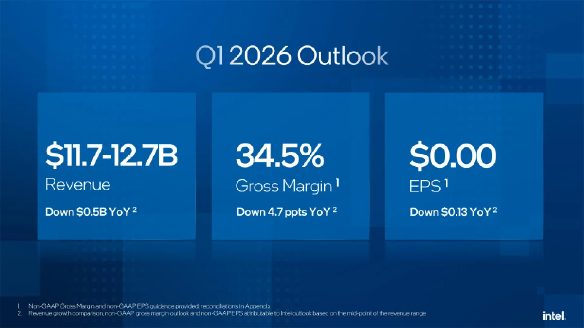 Доход Intel в четвёртом квартале достиг $13,7 млрд, что на 4 % ниже показателя годичной давности, но превзошло консенсус-прогноз аналитиков LSEG, составлявший $13,4 млрд. Скорректированная прибыль в расчёте на одну акцию (non-GAAP) составила 15¢, тогда как прогноз аналитиков LSEG был на уровне 8¢. По стандартам GAAP компания отчиталась о чистом убытке за отчётный квартал в $591 млн, или 12¢ на разводнённую акцию. Годом ранее чистый убыток также был зафиксирован, но он оказался меньше — $126 млн, или 3¢ на акцию.