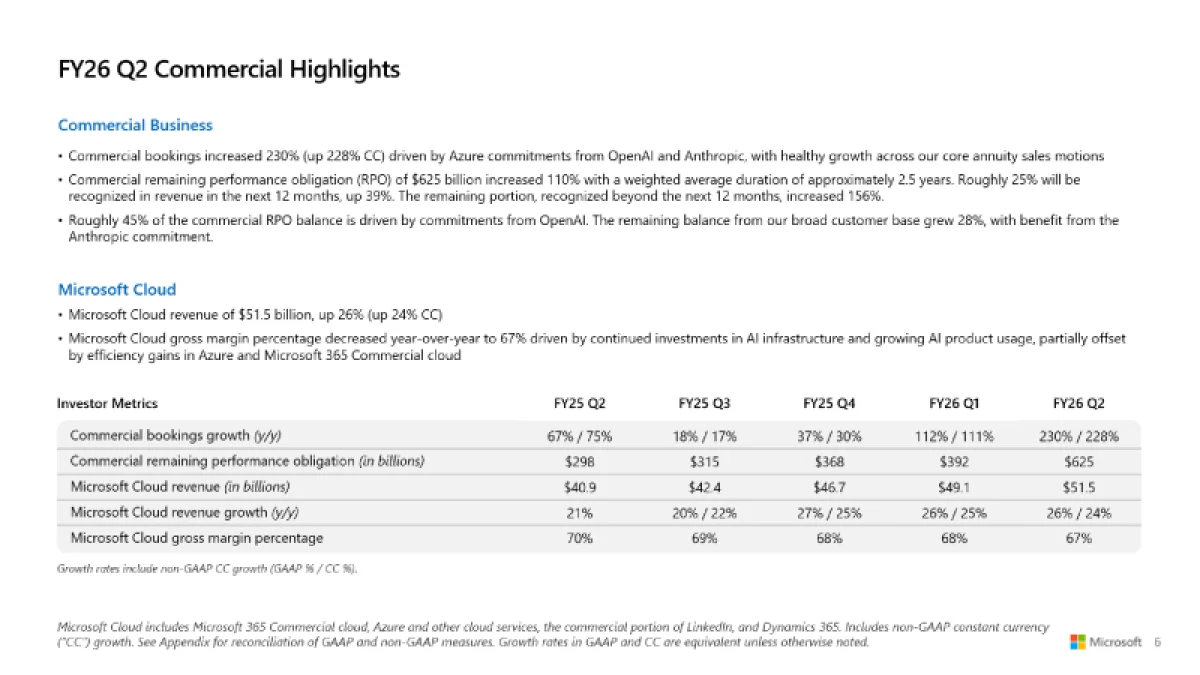 Выручка Microsoft Cloud выросла на 26%, достигнув $51,5 млрд. Объём неисполненных коммерческих обязательств, представляющих собой будущую выручку по заключённым контрактам, увеличился на 110% до $625 млрд. Этот рост во многом обусловлен обязательствами OpenAI перед Microsoft в сфере облачных услуг на сумму $250 млрд в течение квартала. В Microsoft сообщили, что 45% неисполненных обязательств связаны с OpenAI, в то время как остальная часть выросла на 28%.