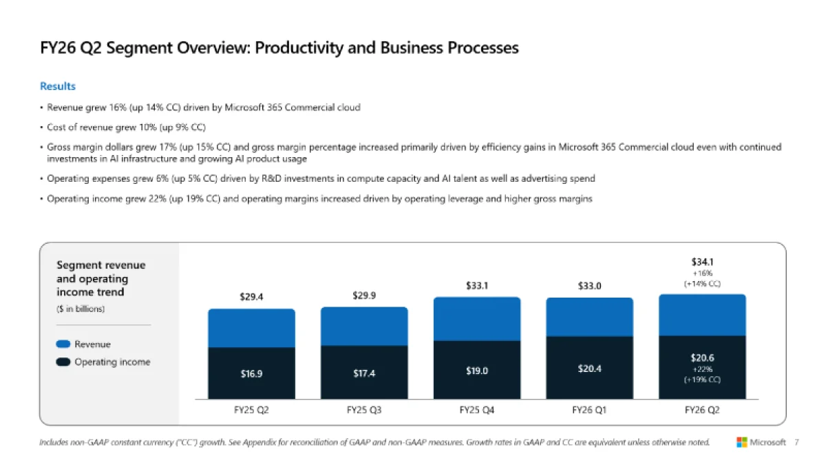 Выручка подразделения «Производительность и бизнес-процессы» (Microsoft Productivity and Business Processes) поднялась на 16 % до $34,12 млрд, что выше консенсус-прогноза аналитиков StreetAccount в $33,48 млрд. Доходы от облачного сервиса Microsoft 365 выросли на 17 %, от потребительской версии Microsoft 365 — на 29 %, от LinkedIn — на 11 %, а от Dynamics 365 — на 19 %.