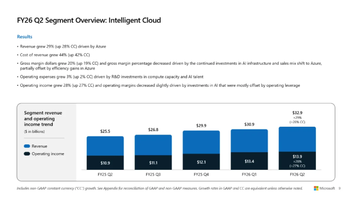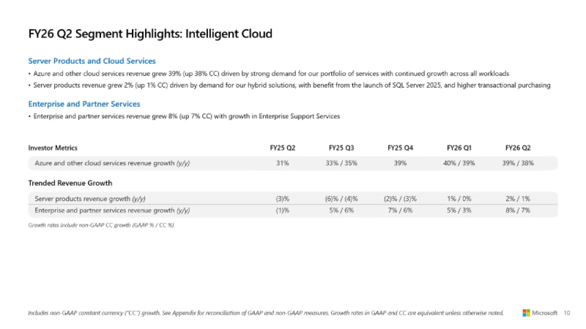 Направление Microsoft Intelligent Cloud, куда входит облачная платформа Azure, принесло $32,91 млрд выручки (увеличение на 29 %), превысив консенсус-прогноз StreetAccount в $32,40 млрд. Рост Azure и прочих облачных услуг составил 39 % против 40 % в первом финансовом квартале. Аналитики, опрошенные StreetAccount и CNBC, ожидали увеличения на 39,4 % и 38,9 % соответственно.