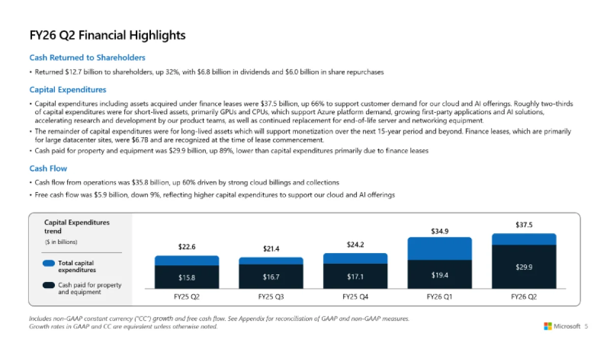 Капитальные расходы и затраты на финансовую аренду Microsoft в отчётном квартале достигли $37,5 млрд, что на 66% превышает показатель годичной давности и превосходит прогноз аналитиков Visible Alpha в $34,31 млрд. Как отметила Худ, около двух третей этой суммы было направлено на краткосрочные активы, такие как графические и центральные процессоры (со ссылкой на MarketBeat). Компания активно вкладывает средства в развитие дата-центров, чтобы удовлетворить растущий спрос на услуги искусственного интеллекта и облачных вычислений. Однако, как сообщает ресурс Investors, в третьем финансовом квартале Microsoft прогнозирует снижение объёмов капитальных вложений.