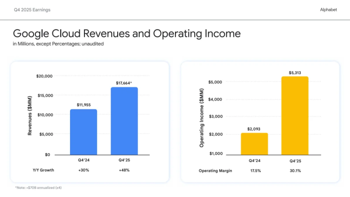 Облачное направление Google Cloud продемонстрировало в IV квартале значительный подъём, в основном благодаря увеличению доходов от Google Cloud Platform (GCP) за счёт ключевых продуктов, инфраструктуры ИИ и решений в области генеративного искусственного интеллекта. Его выручка выросла на 48 %, до $17,66 млрд, превысив ожидания аналитиков StreetAccount в $16,18 млрд. Это самый высокий квартальный рост за последние четыре с лишним года. Операционная прибыль сегмента достигла $5,31 млрд по сравнению с $2,09 млрд год назад. Как отметил аналитик D.A. Davidson Гил Лурия (Gil Luria), рост облачного подразделения «впервые за несколько лет существенно опередил показатели Microsoft Azure», что позволило материнской компании обосновать увеличение капитальных расходов.