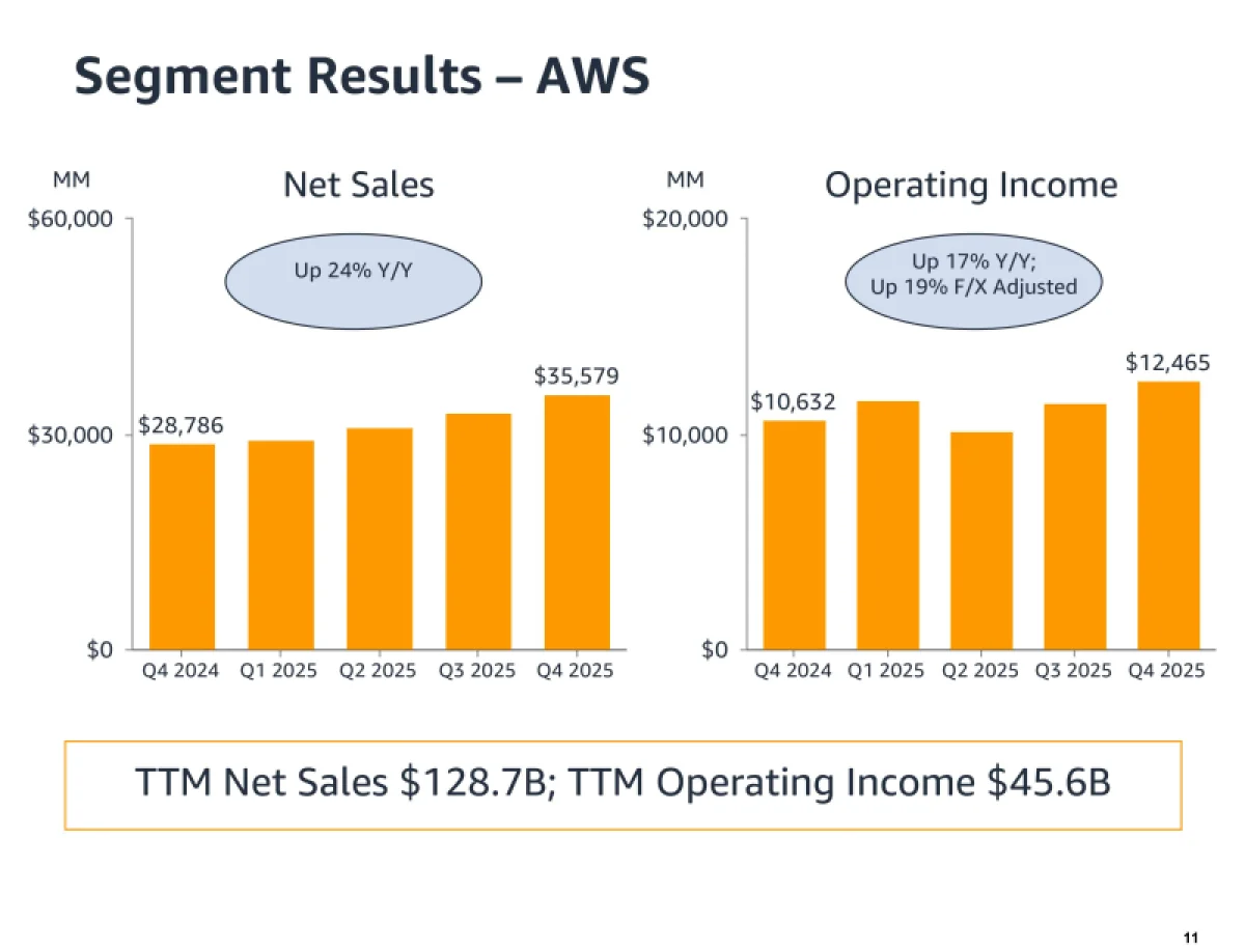 Доход облачного направления Amazon Web Services (AWS) за квартал вырос на 24%, составив 35,58 миллиарда долларов и превзойдя ожидания аналитиков, опрошенных StreetAccount, которые оценивали его в 34,93 миллиарда долларов. Операционная прибыль сегмента AWS поднялась до 12,47 миллиарда долларов против 10,63 миллиарда долларов годом ранее. По заявлению генерального директора Amazon Энди Джесси (Andy Jassy), это стал самый высокий темп роста AWS за последние 13 кварталов.