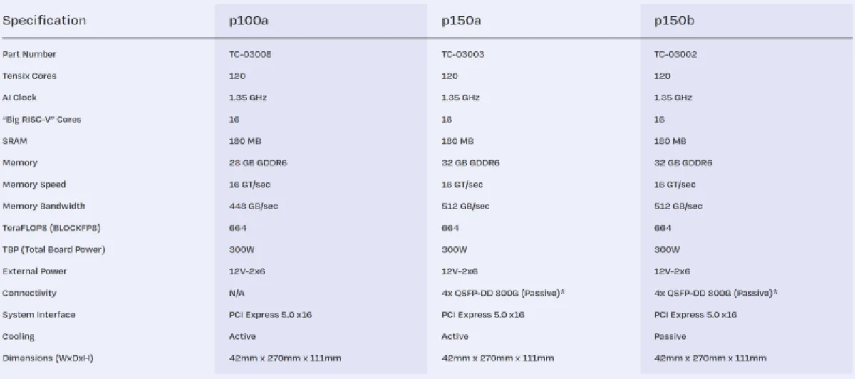 Однако если ранее заявленный пиковый показатель производительности достигал 774 Тфлопс (BLOCKFP8), то теперь он снижен до 664 Тфлопс. Фактически, вычислительные модули младшей модели p100a и более старших p150a/p150b стали идентичными. Всё отличие в технических параметрах между ними, помимо сетевого интерфейса, теперь сводится к объёму и пропускной способности встроенной памяти — 28 ГБ GDDR6 (448 ГБ/с) у базовой версии против 32 ГБ (512 ГБ/с) у топовых.